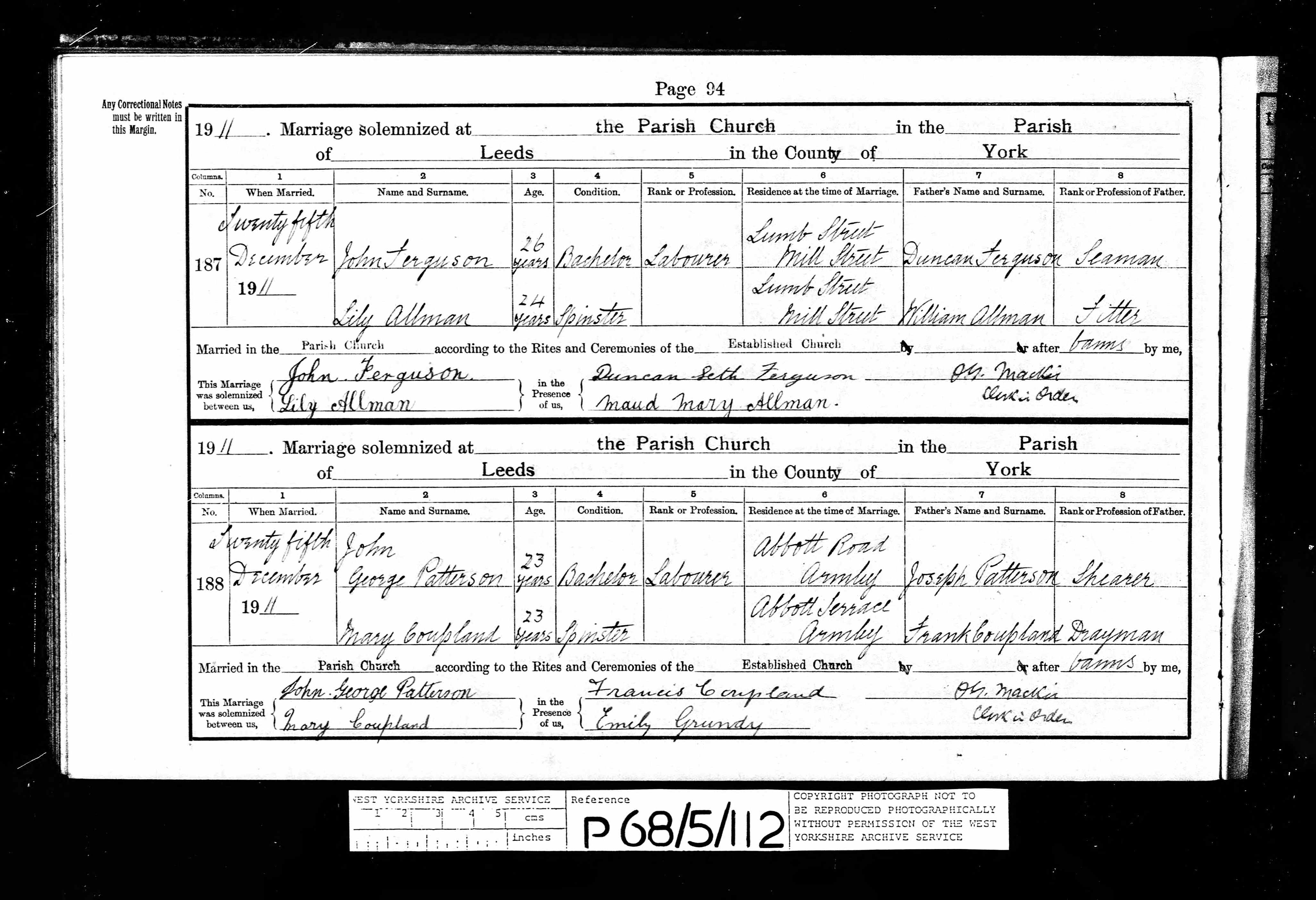 John George Patterson - West Yorkshire, England, Marriages and Banns, 1813-1935