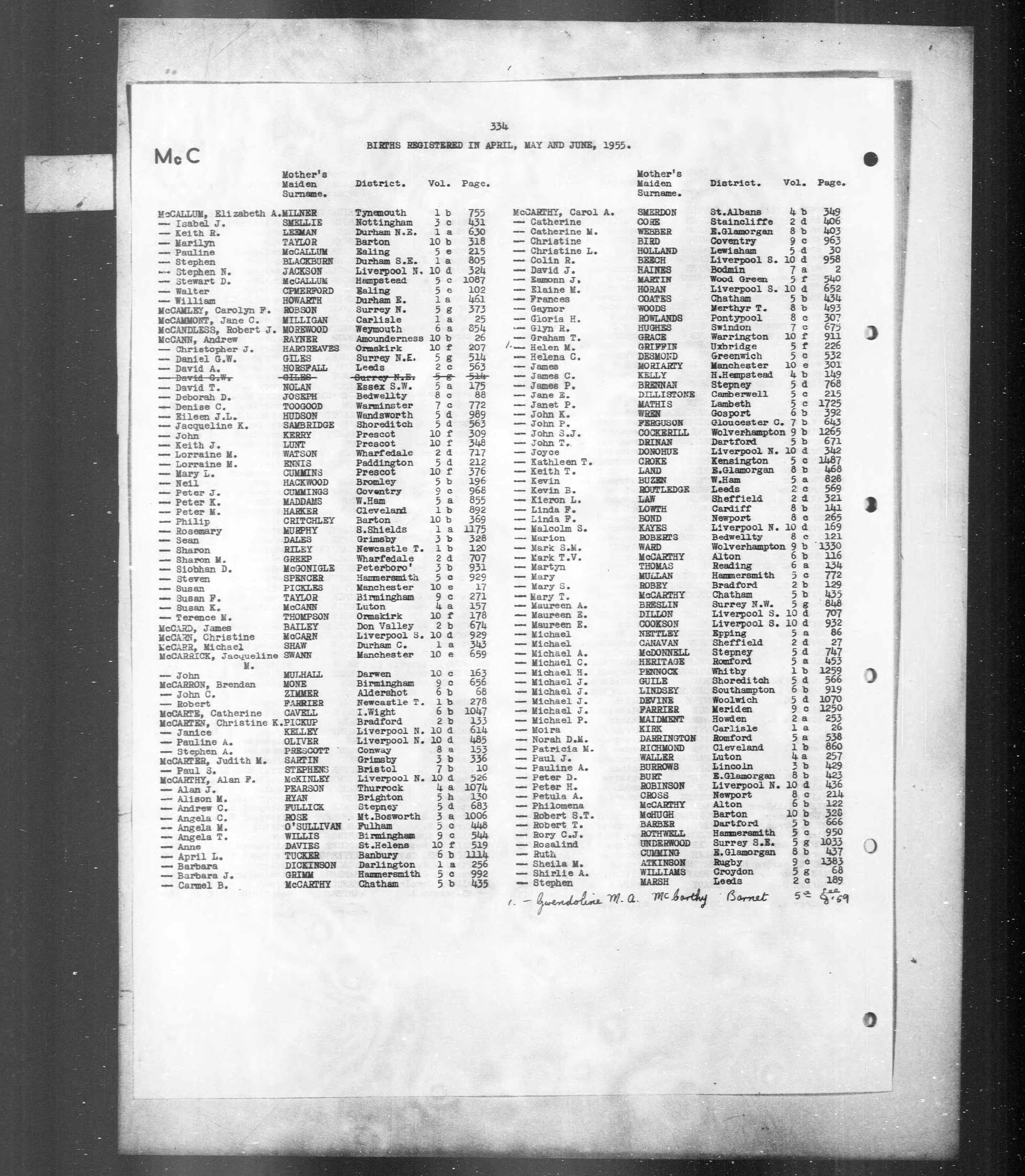 Kevin B McCarthy - England & Wales, Civil Registration Birth Index, 1916-2007